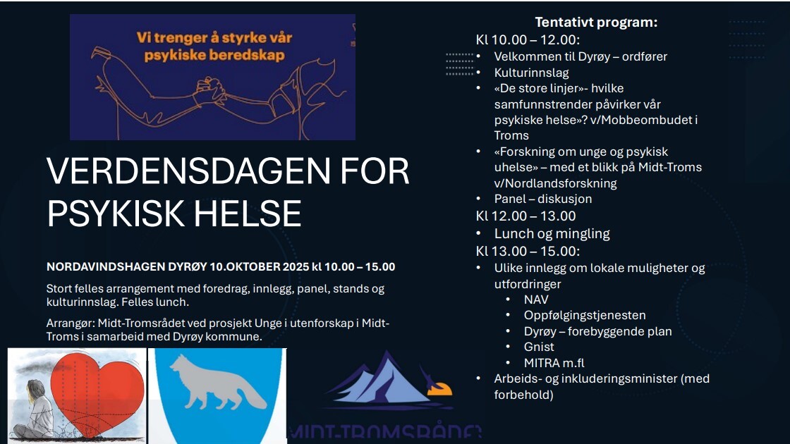 Verdensdagen for psykisk helse Skrevet av Evy Hansen Publisert 18. september 2025 Lytt til teksten Innstillinger Midt-Troms rådet arrangerer felles dag i Dyrøy Se hele invitasjonen her: